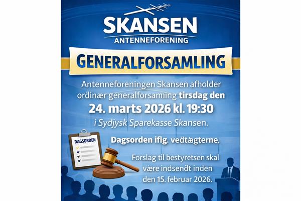 GENERALFORSAMLING Antenneforeningen Skansen afholder ordinær generalforsamling tirsdag den 24. marts 2026 kl. 19.30 i Sydjysk Sparekasse...
