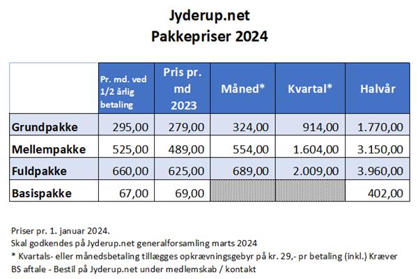 Priserne som opkræves fra januar 2024 skal endeligt godkendes på Jyderup.net generalforsamling i marts 2024.